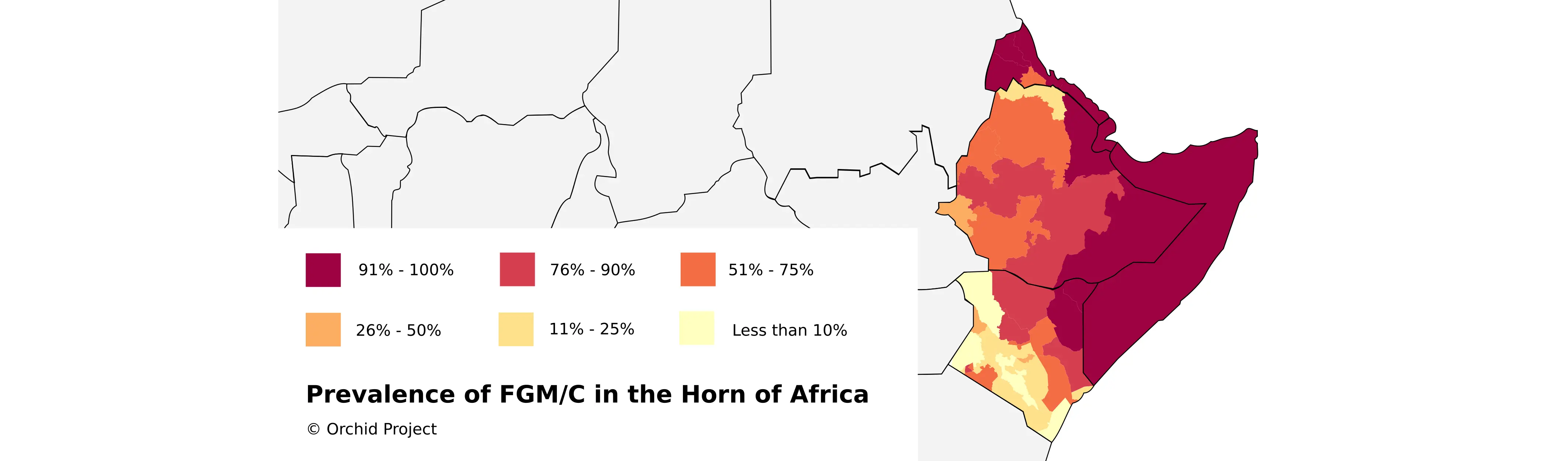 Prevalence rates among Somali ethnic communities across the Horn of Africa remain high at 90%+, in many places almost universal prevalence (99.2%). In Ethiopia and Kenya, national prevalence rates are lower at 65.2% and 14.8% respectively.