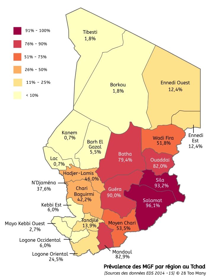 FGM/C prevalence varies widely across Chad. The regions with the highest prevalence are in the south-east: Salamat (96.1% of women aged 15–49), Sila (93.2%) and Guéra (90%). The regions with the lowest prevalence are in the north-west: Lac (0.7%), Kanem (0.7%) and Bourkou/Tibesti (1.8%). Unusually, women aged 15-49 who live in urban areas are more likely to undergo FGM/C (40.1%) than those who live in rural areas (37.9%). Prevalence in the capital city of N’Djaména is 37.6% of women aged 15–49.