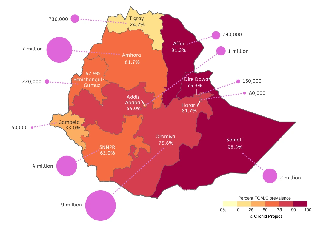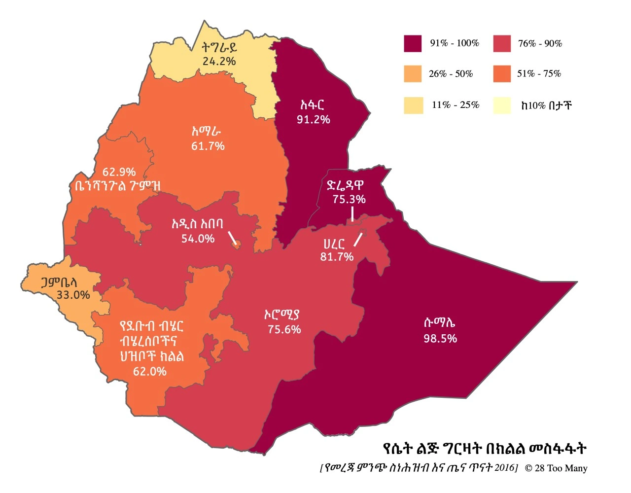 FGM/C is practised across all regions, religions and ethnic groups in Ethiopia. FGM/C among women aged 15–49 is more prevalent in the east of the country, and the region with the highest prevalence is Somali, at 98.5%. The lowest prevalence is in Tigray, at 24.2%. It should be noted that small sample sizes were used in many of the regions, and figures therefore may not be accurate. Women who live in rural areas are more likely to be cut (68.4% of women aged 15–49) than women who live in urban areas (53.9%).
