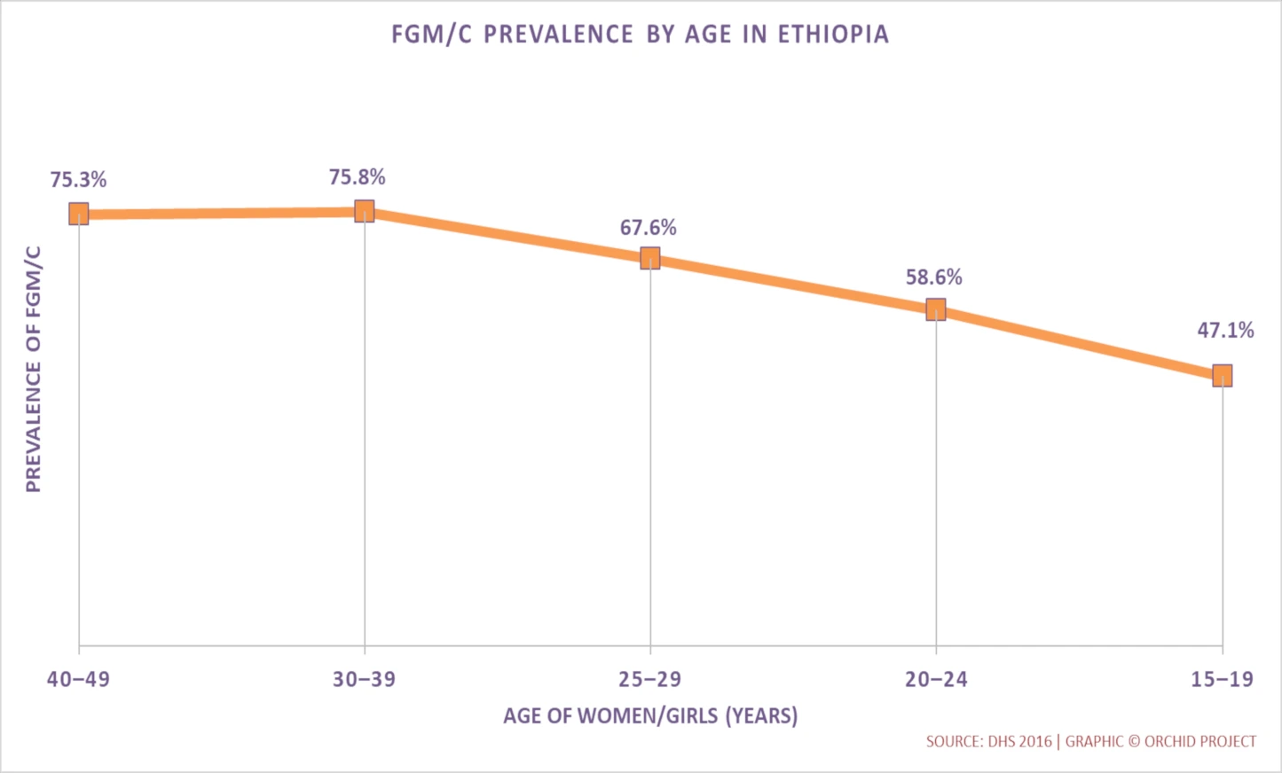 Between 2005 and 2016, the overall prevalence for women aged 15–49 fell from 74.3% to 65.2%. Due to the large age-range of women included, however, the overall prevalence alone may not fully reflect the progress that has been made in recent years. Breaking down the most recent data by age group shows that the prevalence for women aged 45–49 is 75.3%, while for the youngest age group this has fallen to 47.1%. Despite the fact that a small proportion of women may be cut after the age of 15, the lower prevalences among younger women suggest that the practice is declining.