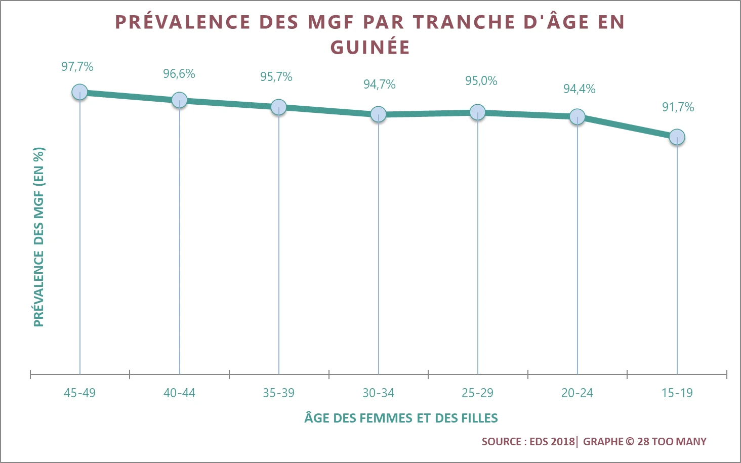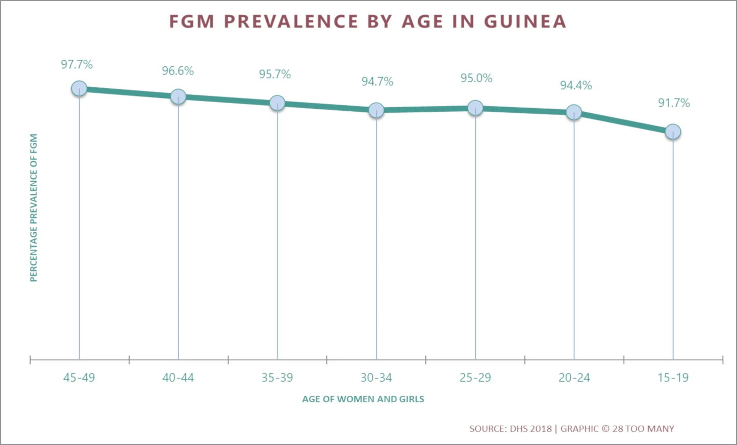 Over the past two decades in Guinea there has been a very small (but statistically significant) decline in the overall FGM/C prevalence among women aged 15–49 (from 98.6% in 1999 to 94.5% in 2018).