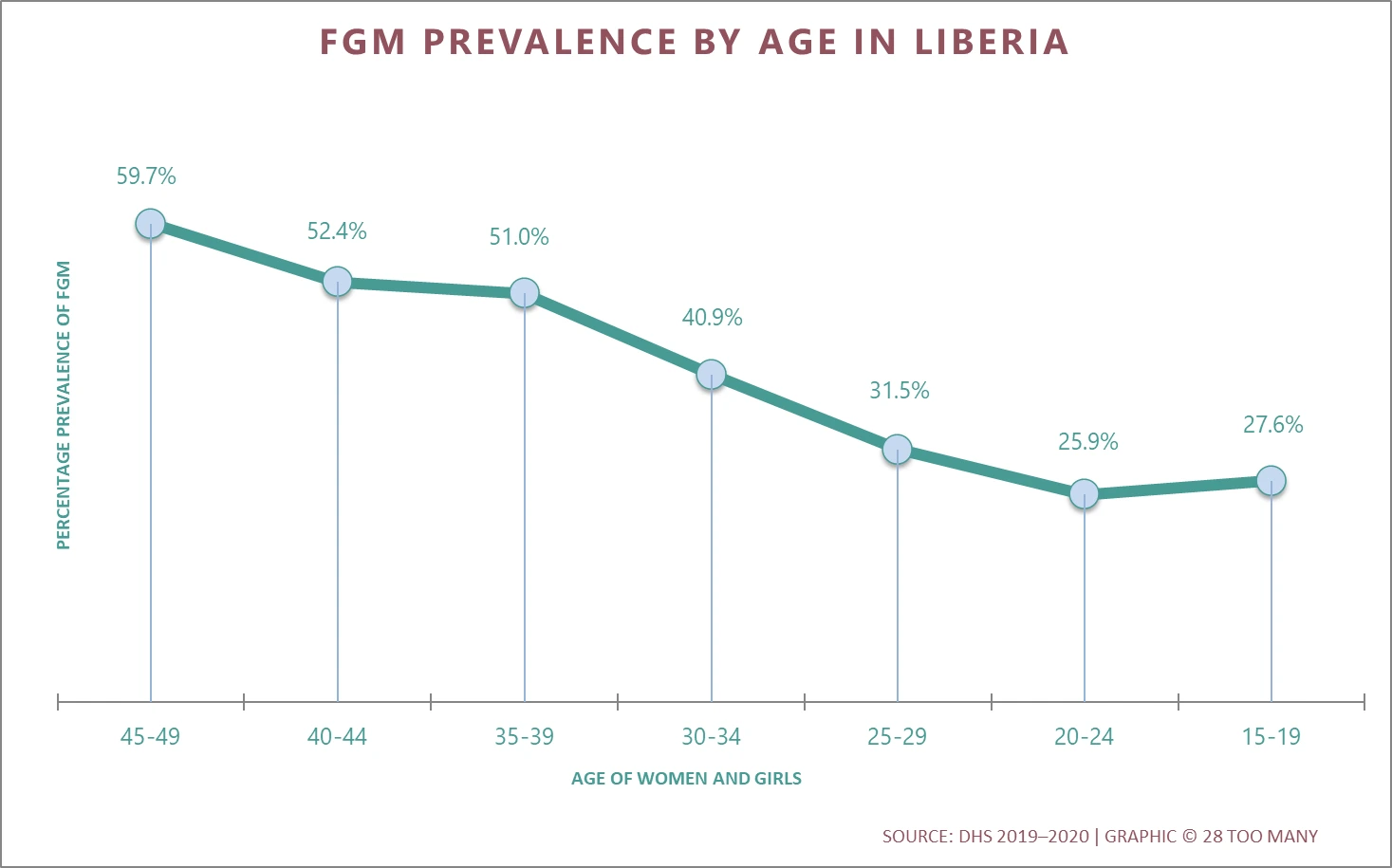 The prevalence of FGM/C among women aged 15–49 in Liberia is 38.2%.