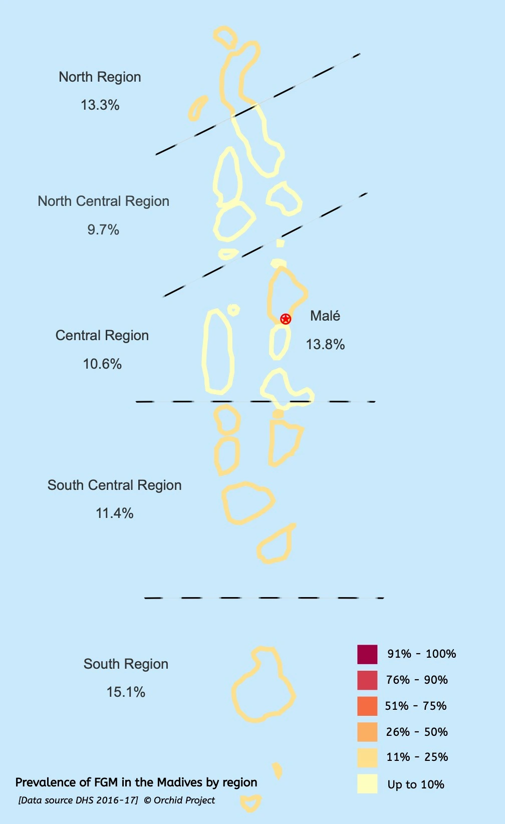 In the Maldives, the prevalence of FGC in women aged 15–49 is 12.9%.