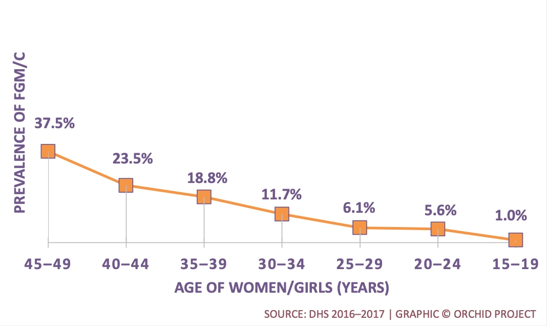 The data suggest that the practice of FGC has significantly reduced over the past 50 years. 37.5% of women in the 45–49 age cohort have undergone the procedure, compared to only 1% of women aged 15–19. Also encouraging is that only 1.1% of the daughters (aged 0–14) of women surveyed by the DHS have been cut. However, although girls are usually cut before the age of five, girls/women may also undergo FGC at puberty or just before marriage.
