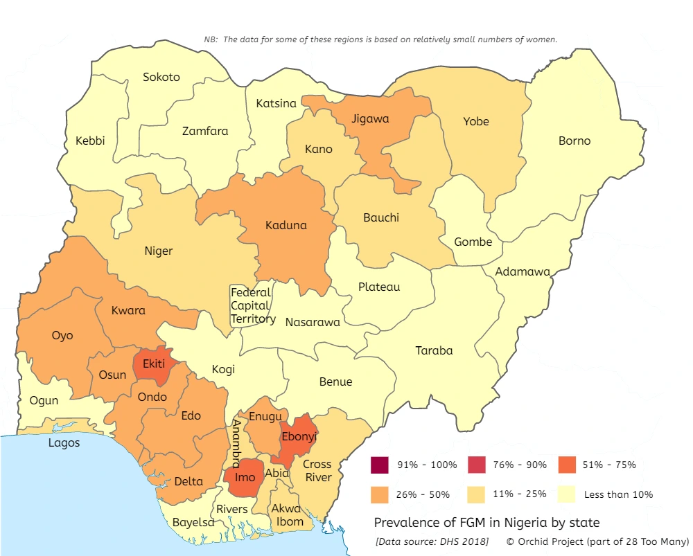 The Zones in Nigeria with the highest FGM/C prevalence are South East (32.0% of women aged 15–49) and South West (30.0%). The highest state prevalence is in Imo State, at 61.7%. It should be noted that the data for some regions is based on relatively small numbers of women. When population numbers are used, however, the priority states change from those with the highest percentages (Imo, Ekiti, Ebonyi, Kaduna, Kwara and Osun) to those with the highest numbers of affected girls/women – Lagos, Kaduna, Imo, Kano and Oyo.