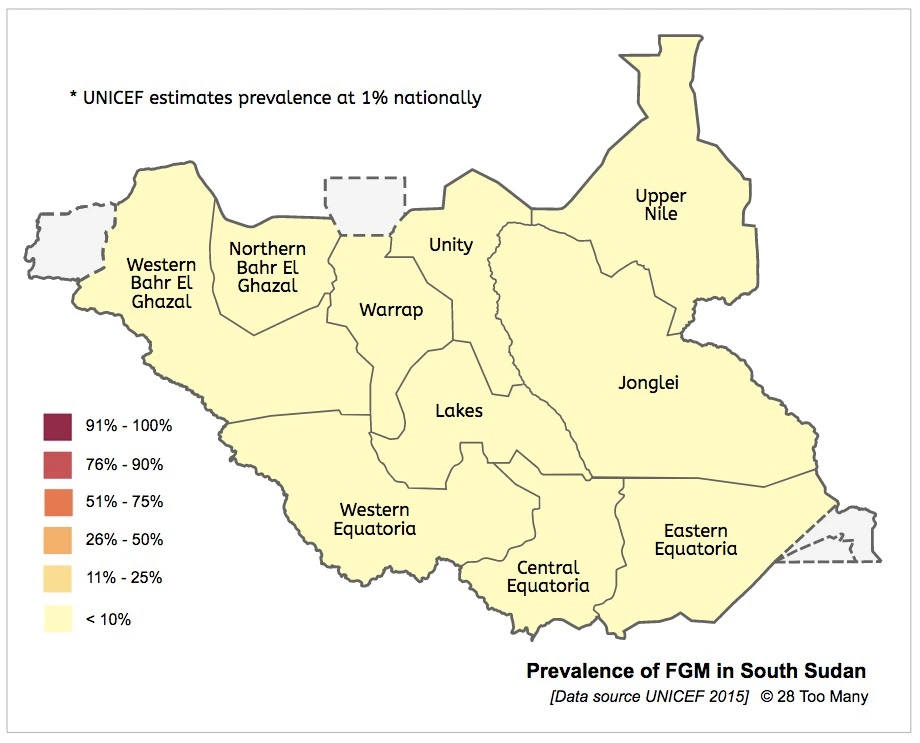 UNICEF previously reported the prevalence of FGM in South Sudan to be 1% among women aged 15–49, but there are no recent surveys to confirm this figure.