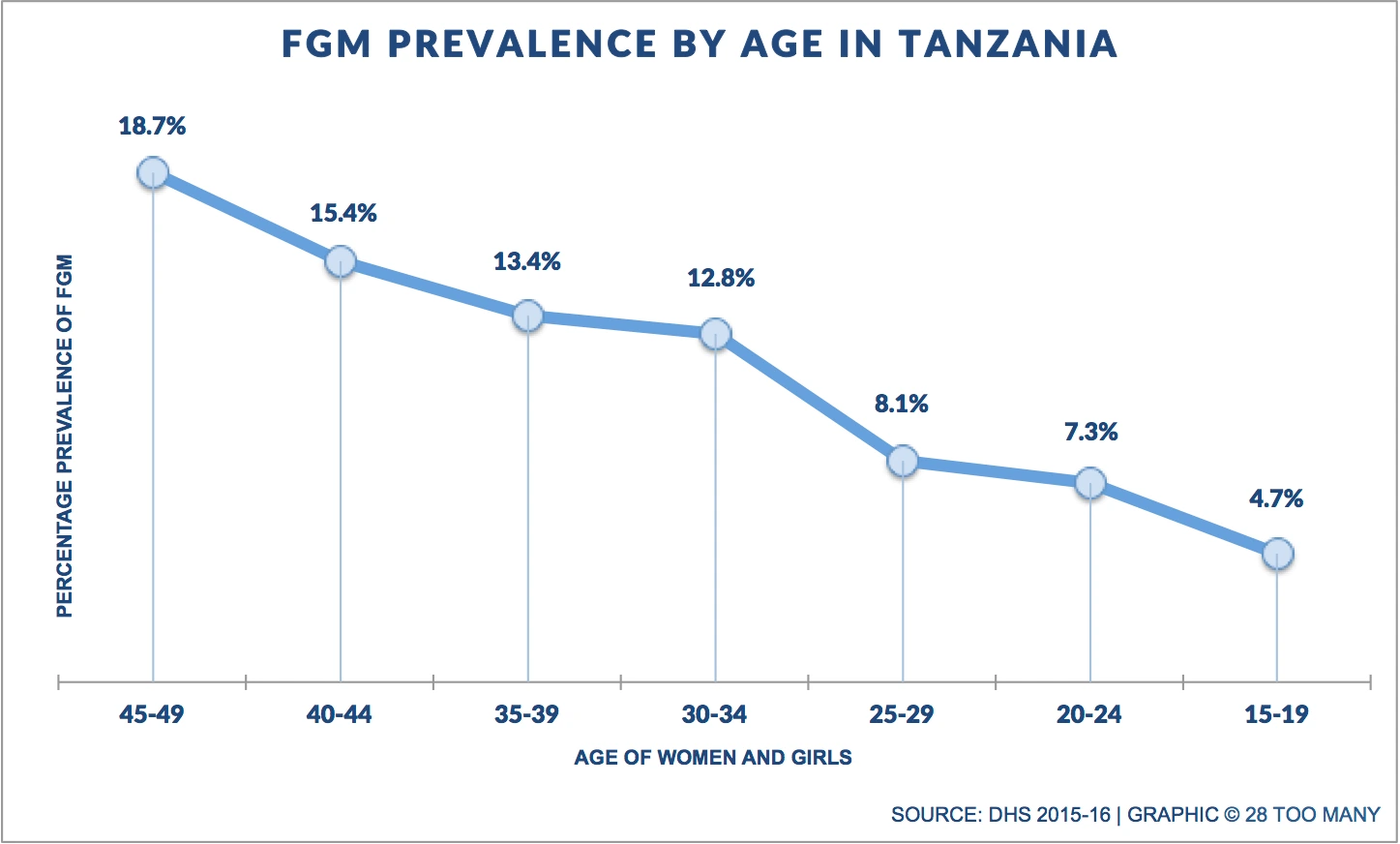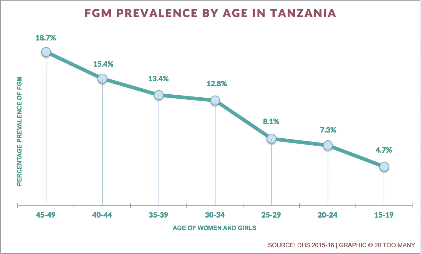 Between 2010 and 2016, the overall prevalence for women aged 15-49 fell from 14.6% to 10%. Due to the large age-range of women included, however, the overall prevalence alone may not fully reflect the progress that has been made in recent years. Breaking down the most recent data by age group shows that the prevalence for women aged 45-49 is 18.7%, while for the youngest age group this has fallen to 4.7%. Despite the fact that a small proportion of women may be cut after the age of 15, the data demonstrates a clear trend towards lower prevalences among younger women.