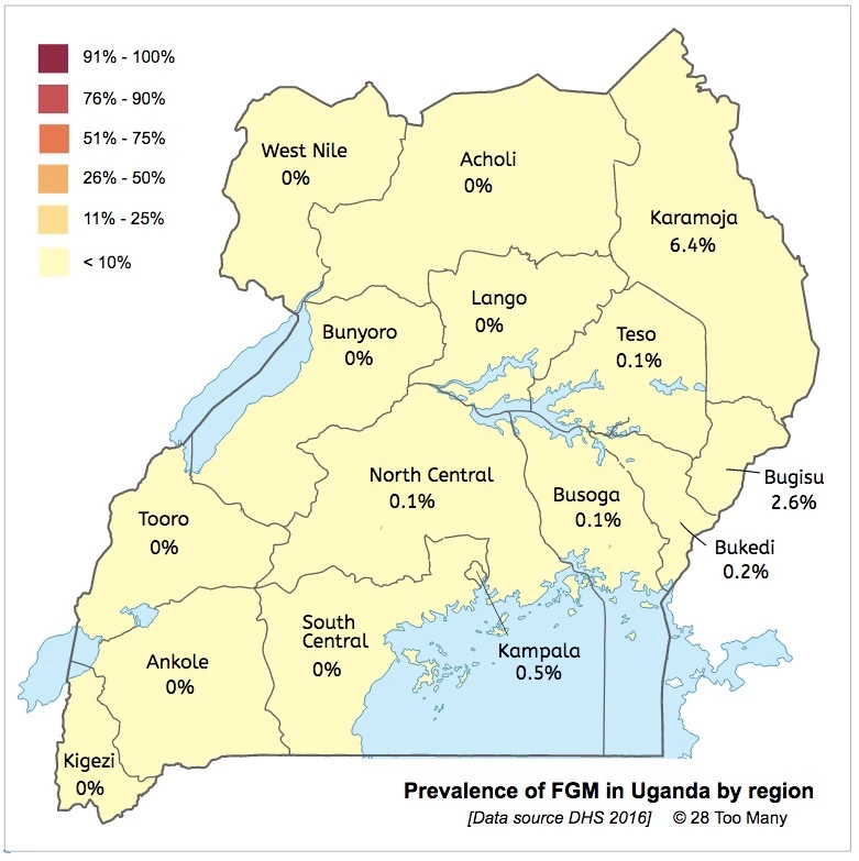 FGM/C in Uganda is mainly practised by the Pokot, the majority of whom live in the Karamoja region in the north-east (which has the highest FGM/C prevalence by region), and the Sabiny, who live in the Eastern region. FGM/C is near-universal (95%) among the Pokot, and is estimated at 50% among the Sabiny, but the prevalence of FGM/C across the entire country is less than 1%. ‘Genital elongation’ (categorised as FGM/C Type IV) is also practised in Uganda (for example, among the Baganda).
