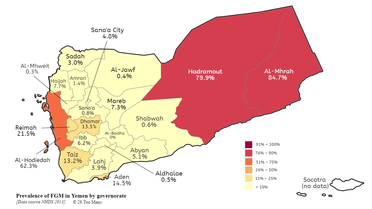 Two of Yemen’s governorates (Al-Mhrah and Hadramout) have an FGM/C prevalence of 80% or higher, and both are in the far east of the country. Prevalence at the governorate level ranges from less than 1% (Al-Baidha, Al-Jawf, Sana’a, Al-Mhweit and Aldhalae) to 84.7% (Al-Mhrah). It should be noted that some of the data at governorate level is based on a small number of women and should be interpreted with caution.