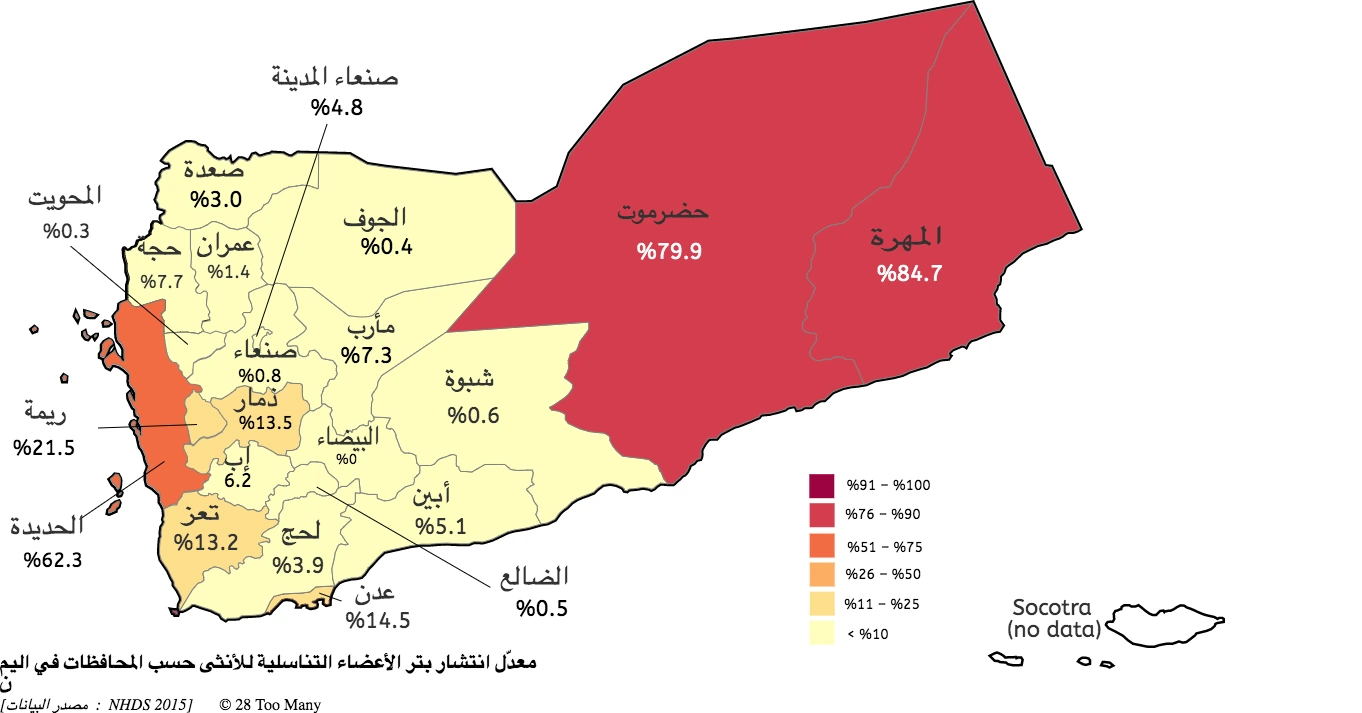 The prevalence of FGM/C among women and girls in Yemen is 19%. Prevalence varies greatly depending on region and is estimated to reach 85% in certain areas.