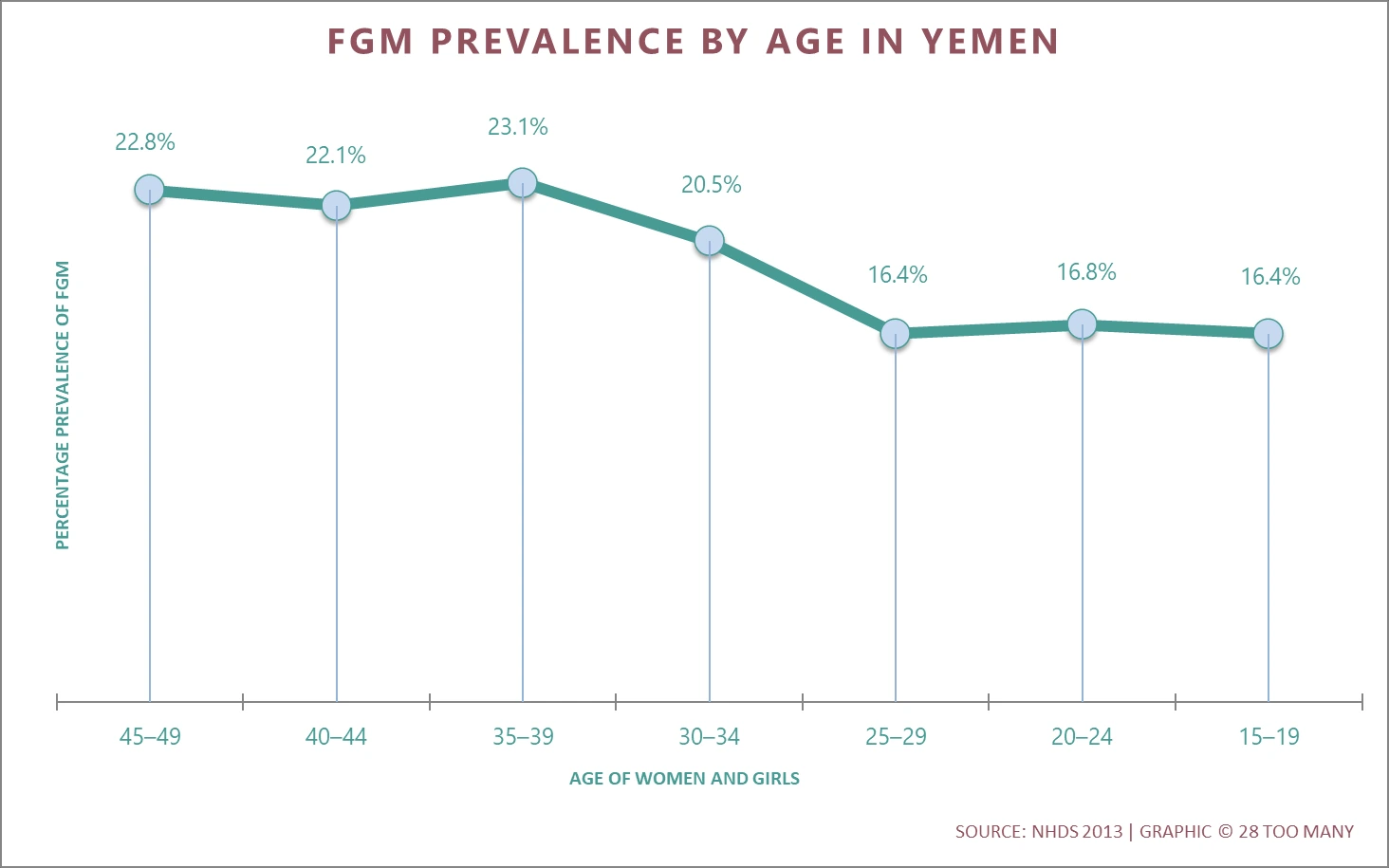 Measurements of FGM/C prevalence prior to 2013 were restricted to women who had been married at any time, meaning that a direct comparison cannot be made. However, breaking down the most recent data by age group shows that the prevalence among women aged 45–49 is 22.8%, while among the youngest age group this has fallen to 16.4%. Despite the fact that a small proportion of women may be cut after the age of 15, the data suggests a trend towards less frequent cutting among younger women.